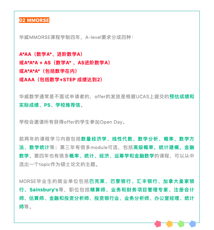 华威Maths和MORSE都是非常热门的专业 ,能拿到高等学位的学生,毕业大多在伦敦等大城市从事高薪工作,或者进入很好的学校继续读研。