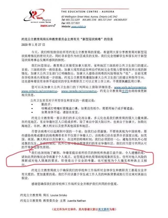 针对这封来自于华人家长的请愿信,约克区教育区随后发布公开信予以回应:加拿大公共卫生部门已明确指出,加拿大人感染该病毒的风险为“低”,目前无需在学校体系内采取进一步措施。
