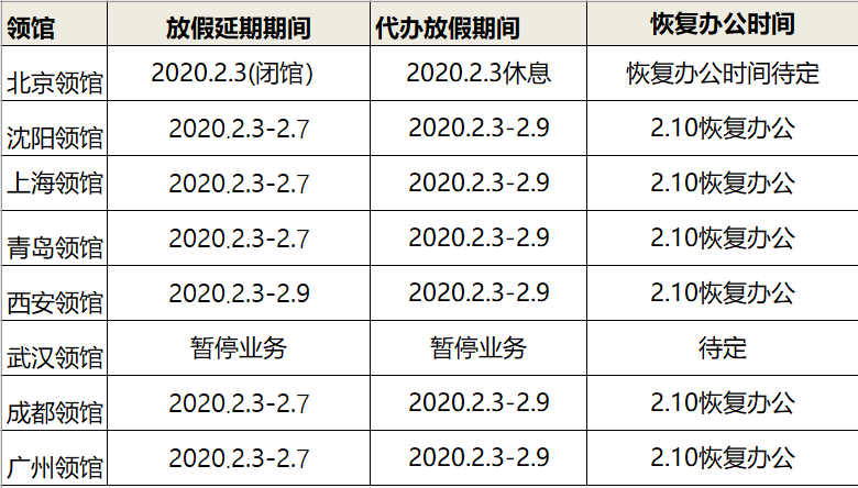以下是目前为止统计的各领馆及代办的假期延长及恢复办公时间。北京领馆于2.3闭馆,开馆时间待定。武汉领馆暂停业务,其余领馆及代办暂定为2.10 恢复办公,具体内容如下图所示: