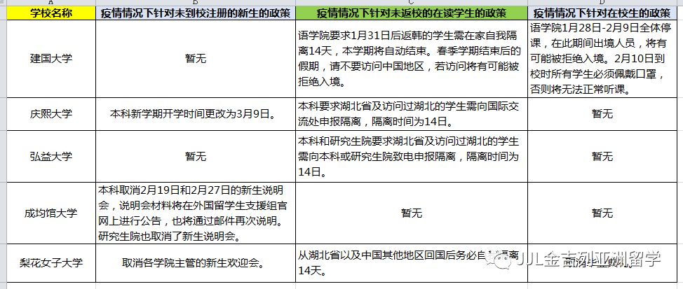 随着新型冠状病毒肺炎在全国乃至世界的蔓延,各地确诊人数不断上涨,使一些即将赴韩留学的学生和家长非常担忧。最近这段时间,金吉列的老师们都在辛苦的收集资料,并且和韩国院校保持积极的沟通,加上和已经在韩国就读的部分学生那里取得的回馈,实时向学生更新最新政策。这里和大家分享一下目前了解到的基本情况: