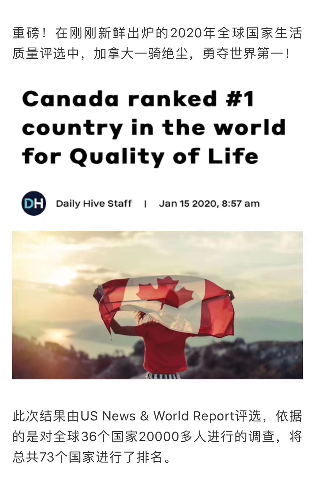 加拿大被评为2020年全球最佳国家,此次结果由US News&Worl Report 评选,依据的是对全球36个国家20000多人进行的调查,将总共73个国家进行了排名,加拿大一骑绝尘,勇夺世界第一!