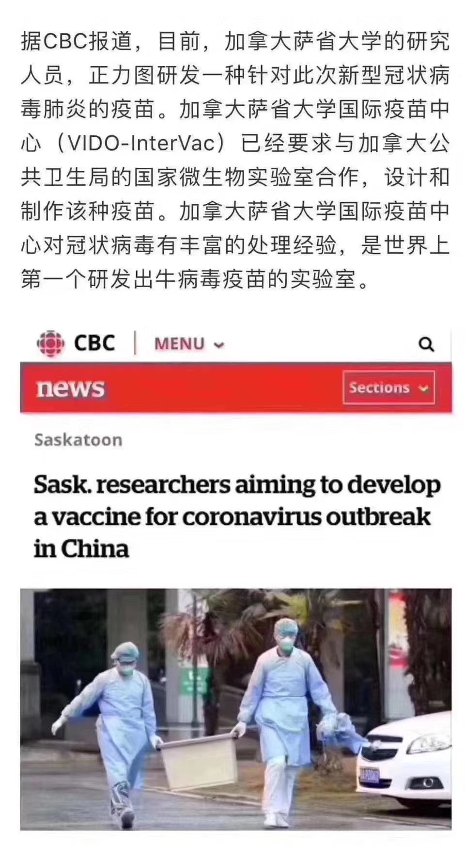 尽管加拿大萨省受新型冠状病毒感染风险较低,但目前加拿大萨省大学已经申请和国家微生物实验室合作开始研发疫苗,加拿大萨省大学国际疫苗中心对冠状病毒有丰富的处理经验,是世界上第一个研发出牛病毒疫苗的实验室(暂时此疫苗未获批用于人类)