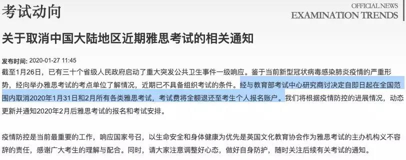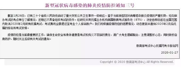 1月27日,教育部考试中心发布通知,雅思主办机构英国文化教育协会、托福主办机构美国教育考试服务处(ETS),决定自即日起 在全国范围内取消2月所有雅思、托福考试,考试费将全额退还至考生个人报名账户 。