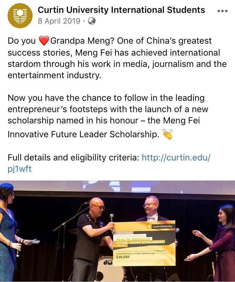 为了鼓励成绩优异的创新性领导人才,孟爷爷在科廷大学 设立了“ 孟非未来新锐奖学金 ” (MengFei Innovative Future Leaer Scholarships) 。