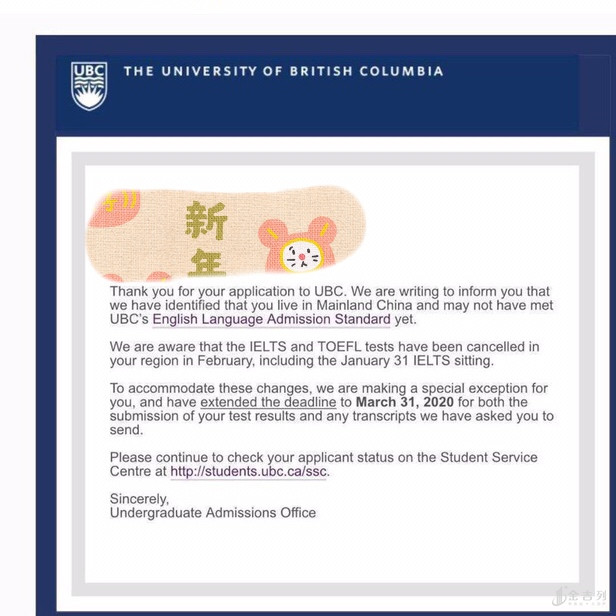 2月份正值留学生们申请加拿大本科院校的截止日期,但由于突发疫情影响,国内1月31日及2月份的雅思及托福考试全部取消,面对此次突发情况,加拿大UBC大学迅速做出反应,针对语言还没有达标的学生由原来的的补交雅思截止时间延长到3月31日,非常贴心,其实1月31日取消的考试,即使没有取消,学生也无法及时出成绩提交给UBC,但是UBC大学依然做出了给中国学生延期的通知,我们应该为UBC这样的顶尖学府点赞。