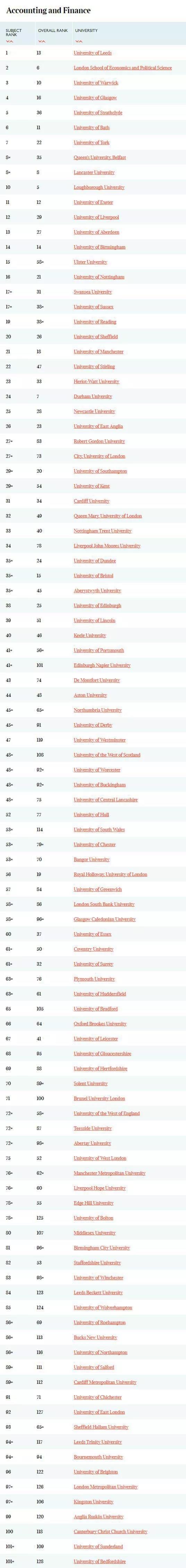 最近陆续帮大家整理了传媒、教育、艺术设计、建筑学、经济学、电子电气工程、计算机等专业的TIMES英国大学排名,今天来给大家整理下会计与金融专业TIMES大学排名。 速速来围观! !