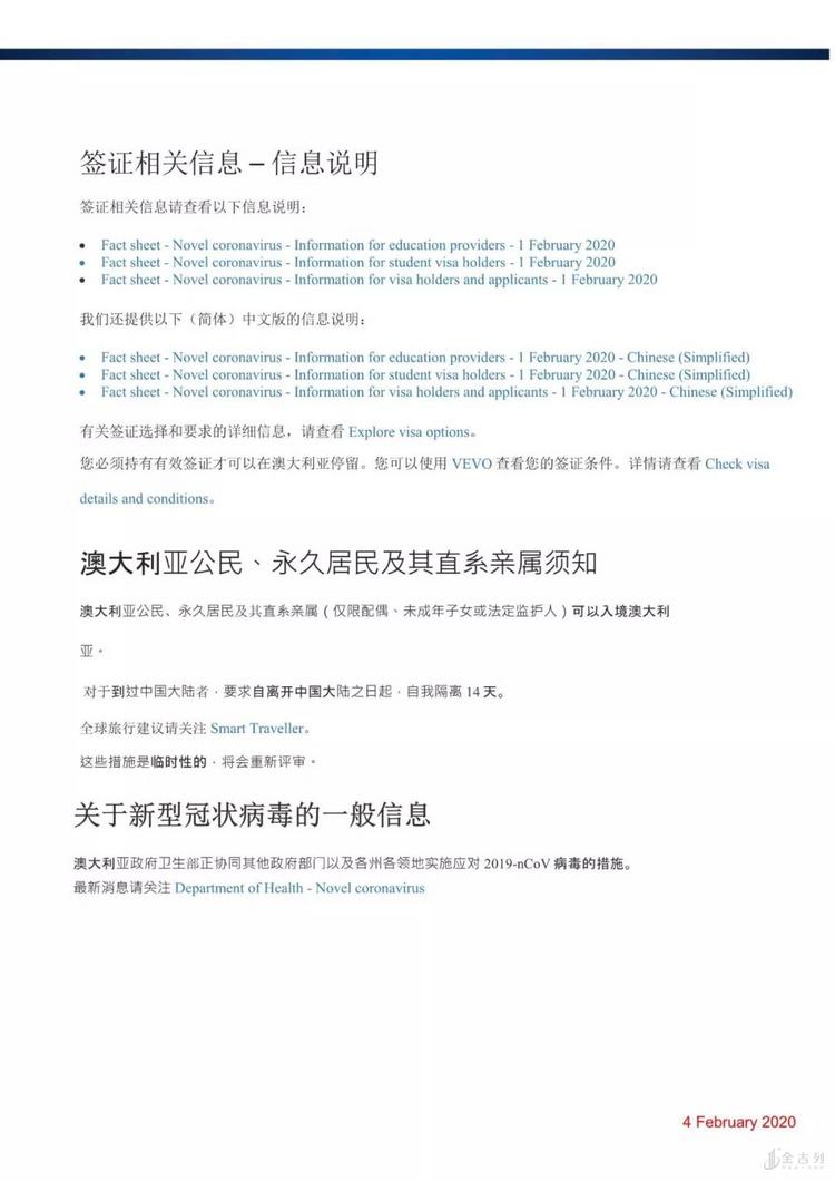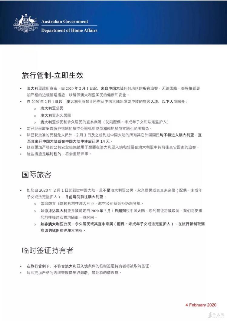 “新旅行限制适用于所有从2月1日起去过或过境中国大陆的外籍人士。这意味着他们在离开或过境中国大陆的14天后才能进入澳大利亚。