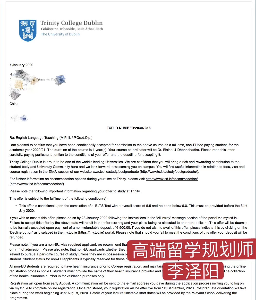 学生是在9月找到李老师,表示以后想做一个英语老师想申请Tesol专业。李老师结合学生的情况,推荐学生申请English Language Teaching 英语教学,因为圣三一大学的Tesol专业需要有两年以上的英语教学经验才可申请,最终在学校开放之后,李老师的团队立即帮学生递交申请,由于圣三一大学的申请目前都是院长或者导师审核,所以整体审核周期较长,有准备申请爱尔兰院校的学生也记得提前准备哦!!!