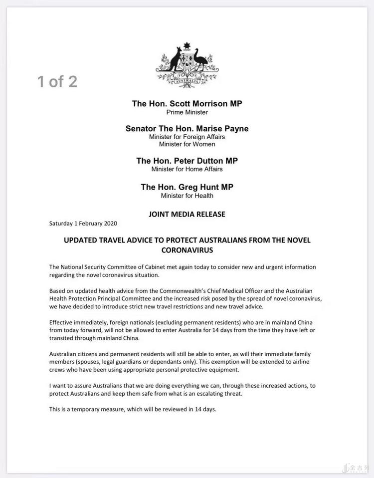 本次澳采取紧急事态措施 为期2周(到2月15日 ),期间澳洲边境将拒绝 从2月1日起 有在中国大陆入境/转机记录的他国公民入境(PR仍可入境)。这其中 包括了学生签证持有者 。两周之后会有新的解释。本月末出行的同学耐心等待。