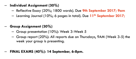 这门课被分为三个部分,个人作业占总成绩的 30%,其中 20% 是写一篇论文, 10% 是写学习日志,每个星期写一篇。小组作业也占总成绩的 30% ,有小组的 presentation 和小组报告。期末考试占了总成绩的 40% 。