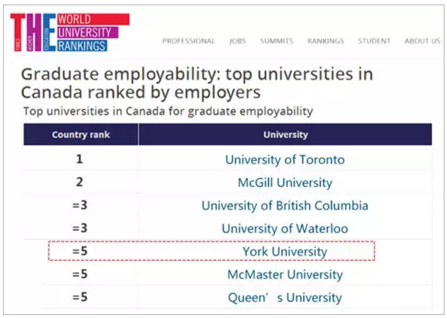 之前提到过,约克大学被泰晤士高等教育专刊 评 为 2017年 最受雇主欢迎的加拿大大学第5位 ,仅次于带有医学院的多大、麦吉尔和UBC。医生的就业率可以说是100%,但国际学生能进入医学院的比率却微乎其微。 而约克大学作为没有医学院的综合类科研型大学,能名列前5,让大家能直观的了解到约克大学毕业生就业情况有多好!