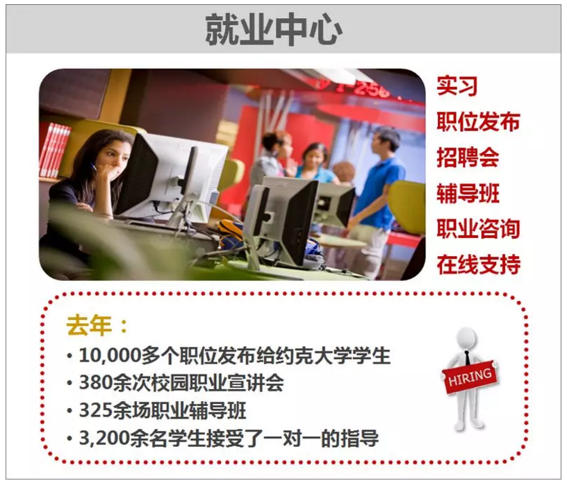 约克大学的就业指导中心,每年为本校学生提供大量独有的招聘资源、举办多场宣讲会/招聘会、并提供免费的一对一简历辅导……最大化你成功的可能性!
