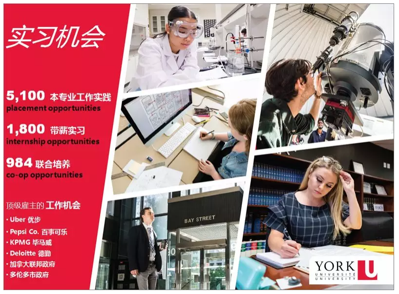 最难找的工作是什么?是你 人生中 第一份工作!白纸一张的简历很难敲开雇主的大门。实习机会帮你解决这个难题! 约克大学每年提供近万个带薪/不带薪的实习(internship)和联合培养(co-op)机会。 (比如普通商科学生,只要大一至大三均分保持在B(70%)以上,约克大学100%提供带薪实习的面试机会。)