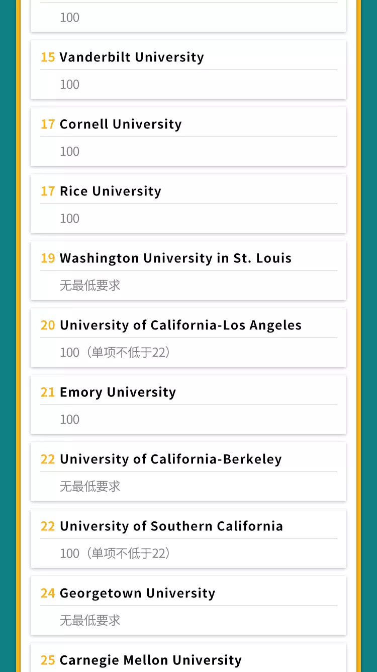 2020年TOP30美国大学托福成绩要求