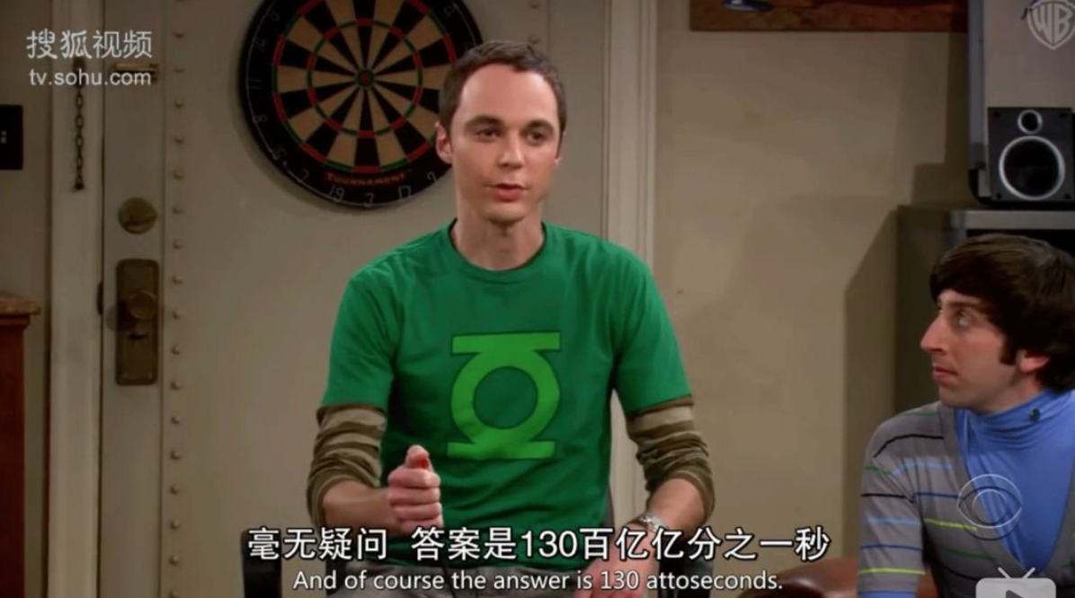 生活大爆炸想必大家都非常熟悉, 第一季第13集中,Shelon,Leonar,Rajesh,Howar还有Penny五人组组织了一次物理碗(Physics Bowl)大赛的练习赛,由Penny担任主持人。Penny从一开始便提出非常富有挑战性的问题: “有史以来最短的光脉冲是多少?” Shelon很快反映出答案,回答道 “毫无疑问,答案是130百亿亿分之一秒”.