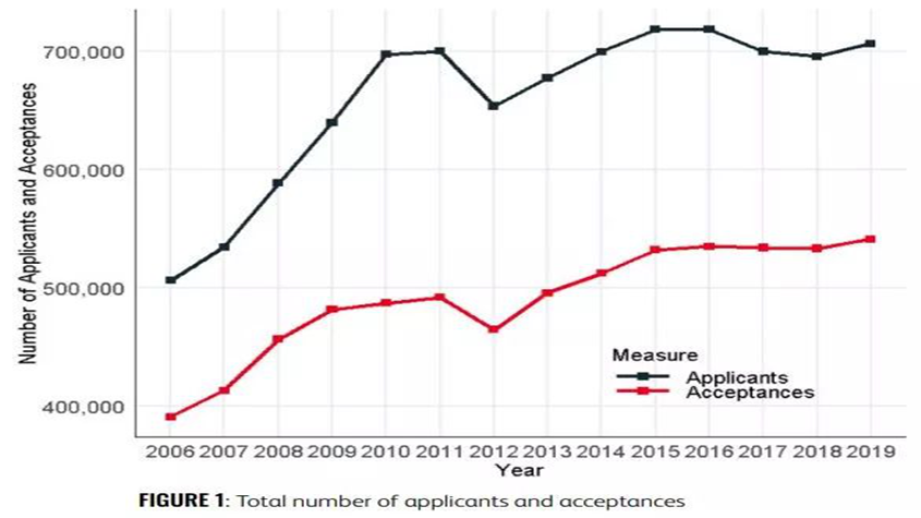 2019入学申请人数达到破纪录的706,435人,实际录取541,240人,两项均比以往有所增长。