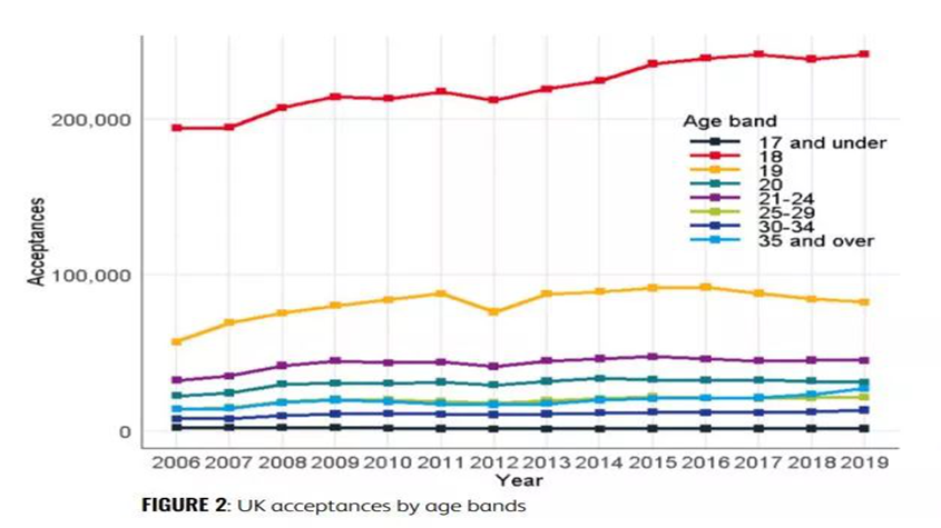 Firm仍就是最主要的录取途径,68.8%的申请者,也就是372,290名学生均是第一志愿录取,相比2018年有所减少。Insurance录取35,440人,比去年增长了255人。英国18岁成功申请者中,73.6%是 firm录取。