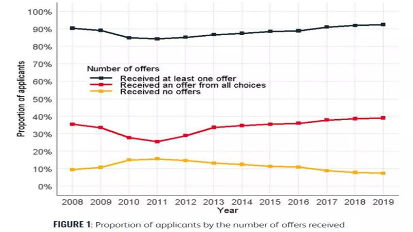 主要申请周期中(6月30日前申请),92.5%(589,845人)的申请者至少获得一份offer,同比增长0.7%。