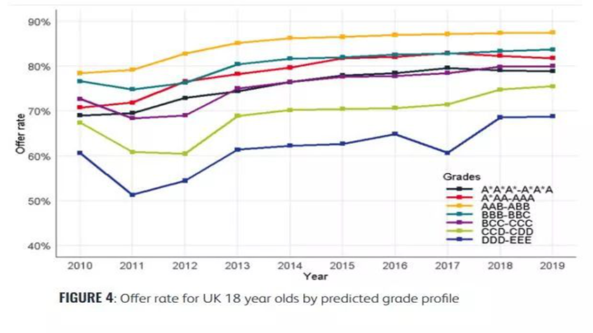 主要申请周期中,预估成绩AAB – ABB的英国18岁学生获得offer的机会最大,这一数字为87.5%,比去年提升0.1个百分点。