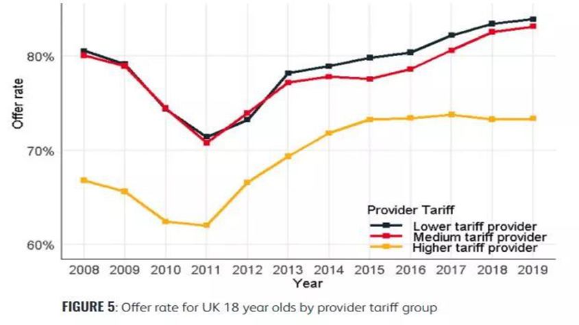 高UCAS成绩学校和低UCAS成绩学校的offer率都提高了0.5个百分点。高UCAS成绩的学校offer率73.4%,中间的学校offer率是83.1%,在这三类学校中,低UCAS成绩的学校录取率最高,达到83.9%。