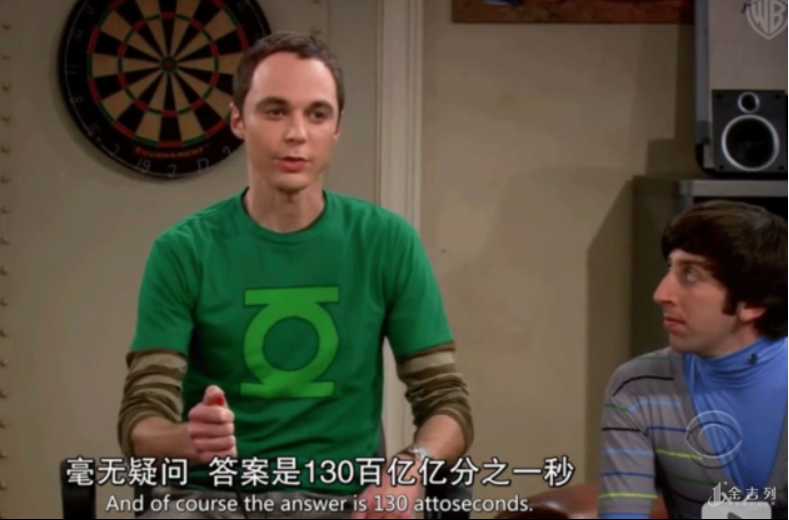 生活大爆炸想必大家都非常熟悉, 第一季第13集中,Shelon,Leonar,Rajesh,Howar还有Penny五人组组织了一次物理碗(Physics Bowl)大赛的练习赛,由Penny担任主持人。Penny从一开始便提出非常富有挑战性的问题: “有史以来最短的光脉冲是多少?” Shelon很快反映出答案,回答道 “毫无疑问,答案是130百亿亿分之一秒”.