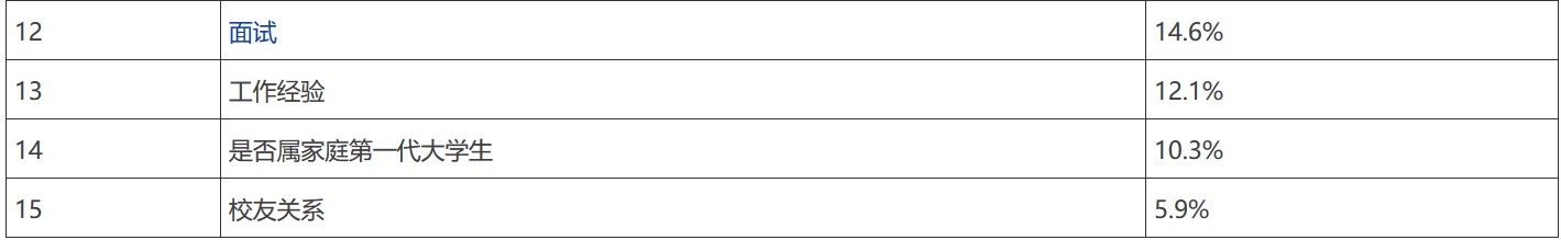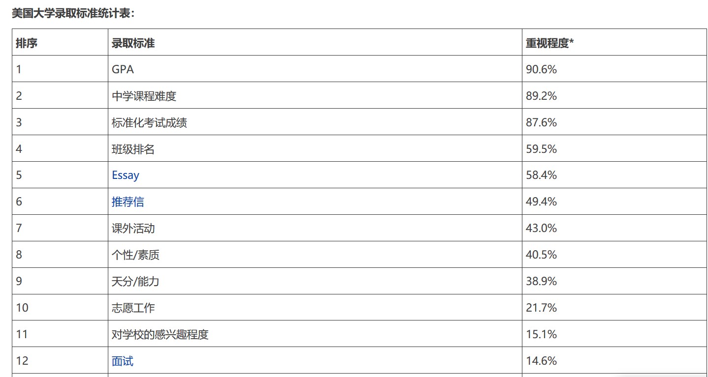 上表是对美国437所学校录取标准的统计,其中重视程度指的是,将该录取标准列为“重要”或“非常重要”参考因素的学校占比。以GPA为例,参与统计的437所美国大学中共有396所将GPA列为“重要”或“非常重要”参考因素,该值即为(396/437)*100%=90.6%,也即90.6%的学校认为GPA为录取决策中”重要“或”非常重要“的参考因素。根据该表可知,GPA最为美国学校看重——既不是一般中介顾问所谓的”软实力“、也不是人们常规意识里所谓的”分数线“。