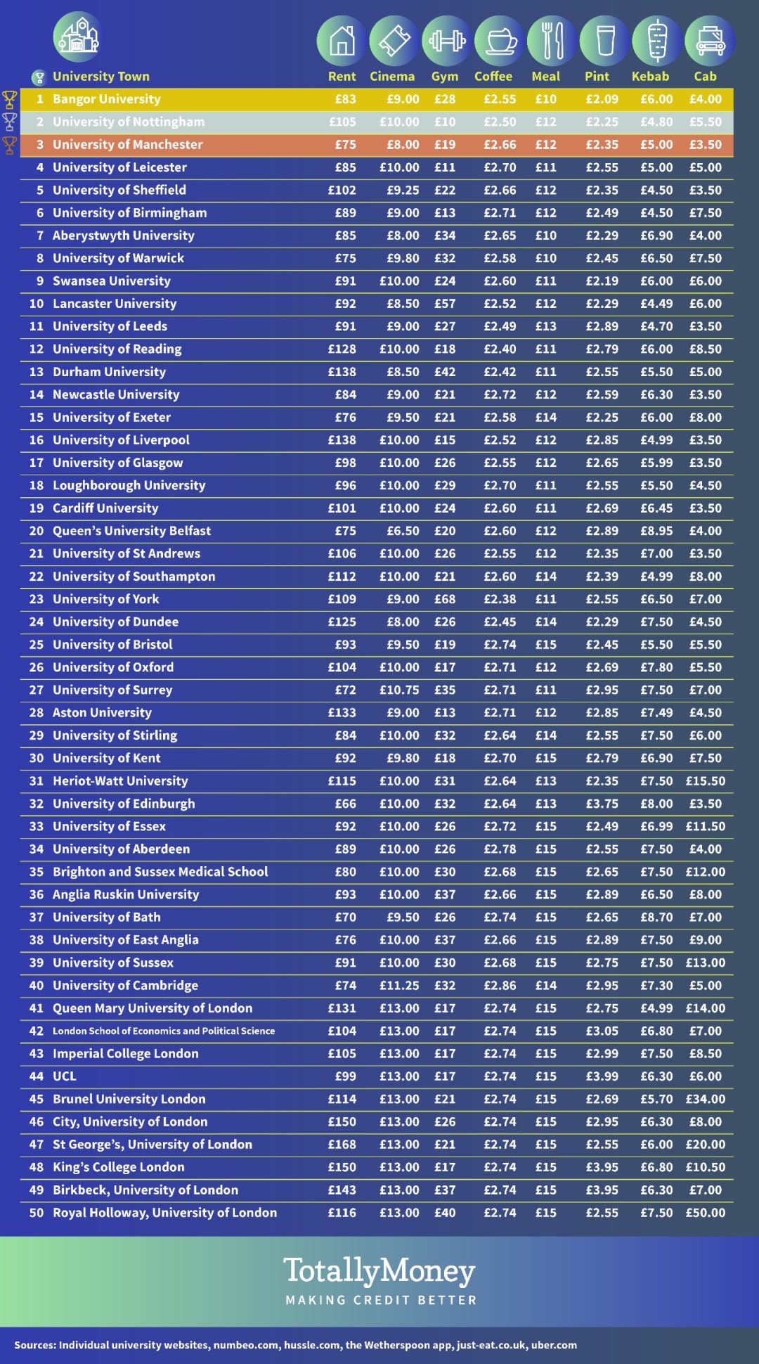 英国totally money 网站为那些想要“节俭”一些的学生制作了一份“2019英国最省钱大学排行榜”,这份榜单从4大方面8个标准来评价英国大学的生活成本。