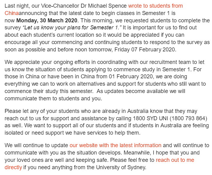 悉尼大学受疫情影响的学生会 收到一封来自校方的电子邮件, 邮件标题为Let us know your plans for Semester 1, 其中附有调查问卷的链接。请顾问老师通知相关学生最好在明天中午之前填写完成。学校会最大化满足学生的个人需求。