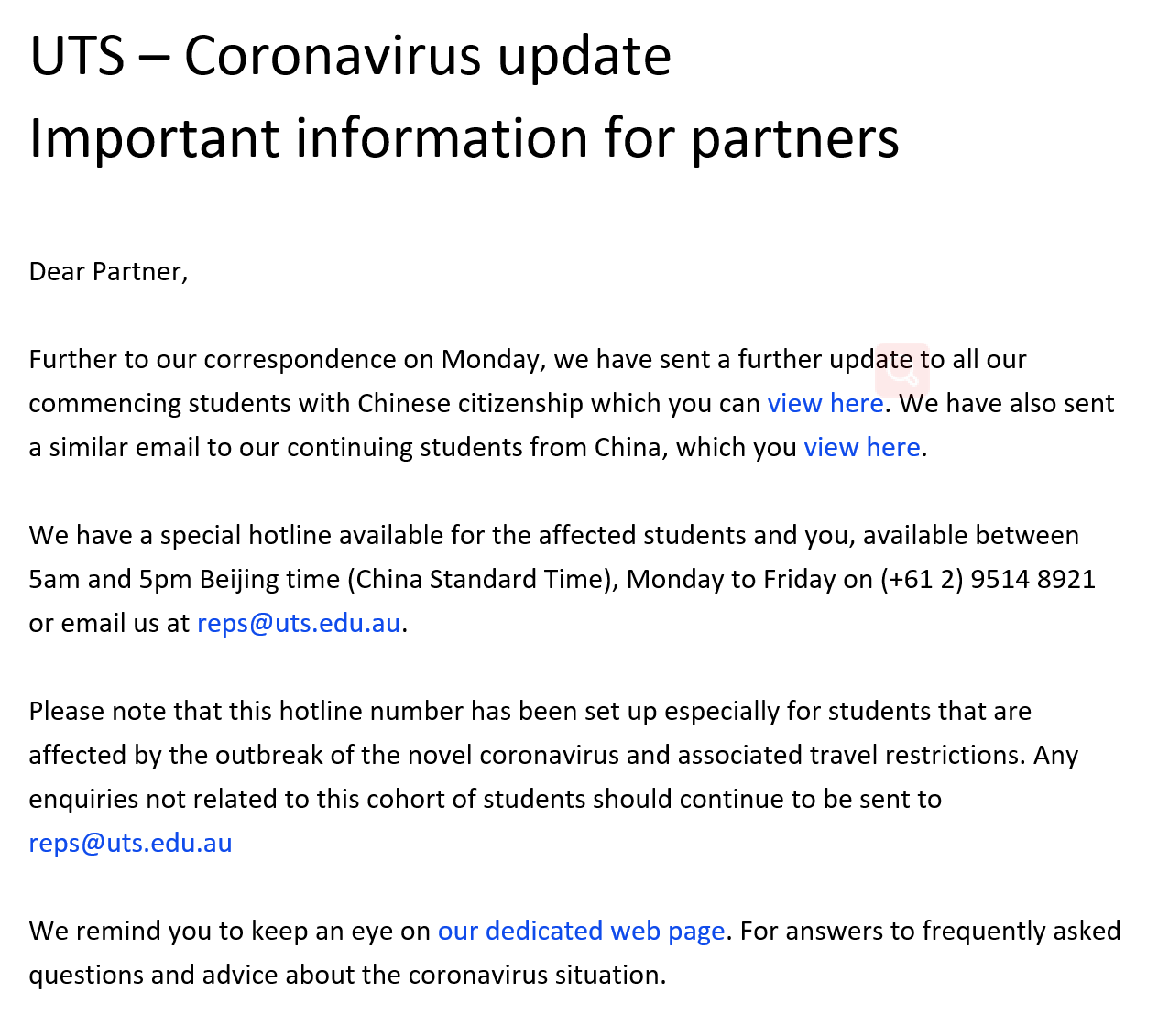 请注意该热线只是针对受疫情爆发和交通禁令影响的学生使用,与此无关的咨询请邮件 reps@uts.eu.au