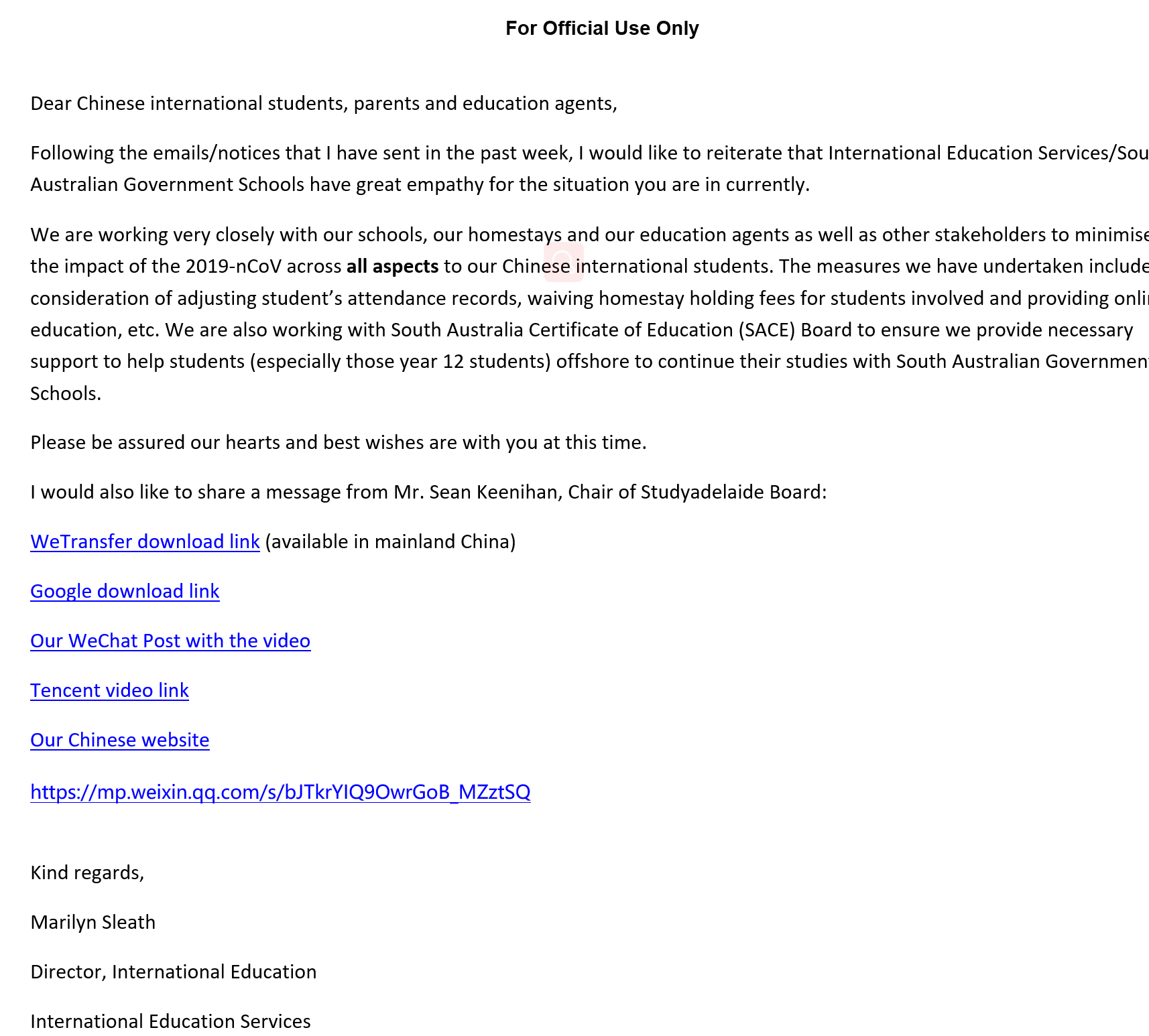 继上周发出的电子邮件 / 通知后,南澳州教育部国际教育处重申,南澳州公立学校对来自中国的留学生、学生家长和所合作的留学中介们目前的处境感同身受。