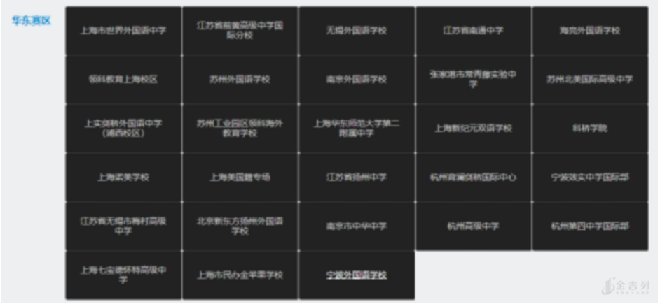 中国共设有华东、中西部、华南和华北4个不同的赛区。华东赛区有南京外国语学校、江苏省扬州中学、苏州国际预科学校、北京外国语大学附属苏州湾外国语学校和无锡外国语学校等(具体见下图)。