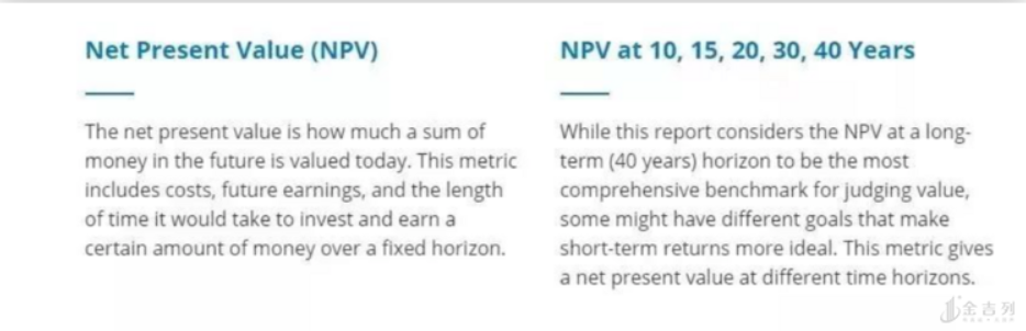 净现值指的是,投资项目在未来各年产生的现金流,按照一定的贴现值折算为现在的价值,减去初始投资,所得的余额。 NPV越大,将来的利润也越大。 如果NPV为负,则表明该投资可能会亏本。 10年NPV指的是该笔投资10年后产生的净现值,20年NPV也依此类推。