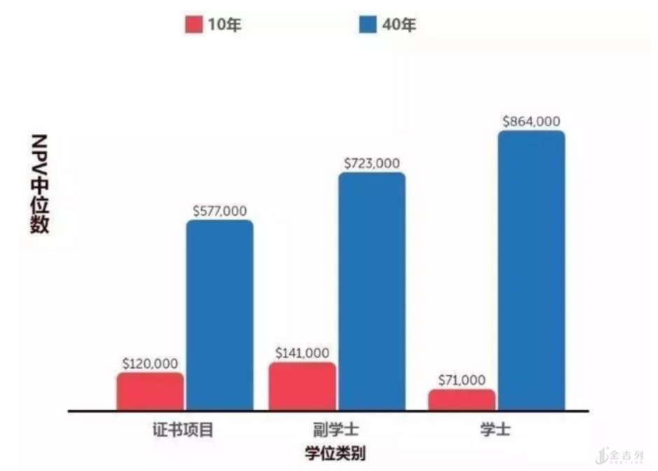 由于NPV计算方式将时间纳入了考虑范围,一个投资项目越早开始产生利润,它的NPV也会越高。 因此,短期的社区大学及证书项目所花时间较短、学费较便宜,学生很快就能从学校毕业、开始挣钱,因此短期NPV较高。