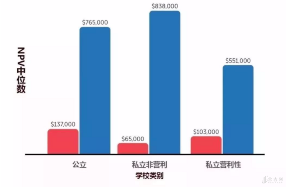 长期来看,在还完高额的学生贷款后,私立学校的平均40年NPV为838,000美元,要比公立学校的765,000美元高得多。