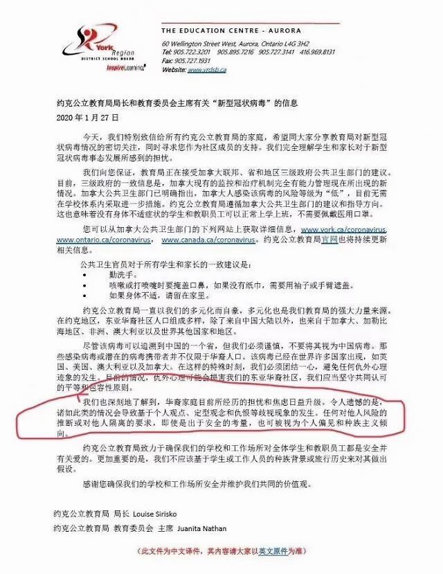 约克区教育局董事务主席Juanita Nathan还写道:“我们了解华裔家庭的担心和焦虑加重,那些假设其他人有风险,要求隔离的人,即使是出于好意和安全考虑,也可以被看作是个人偏见和种族主义倾向。”