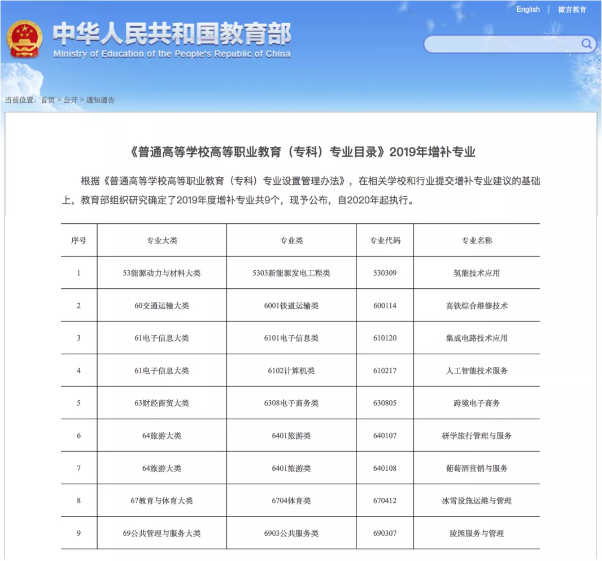 近日,教育部官网公布,根据《普通高等学校高等职业教育(专科)专业设置管理办法》,在相关学校和行业提交增补专业建议的基础上,教育部组织研究确定了2019年度增补专业共9个,自2020年起执行。