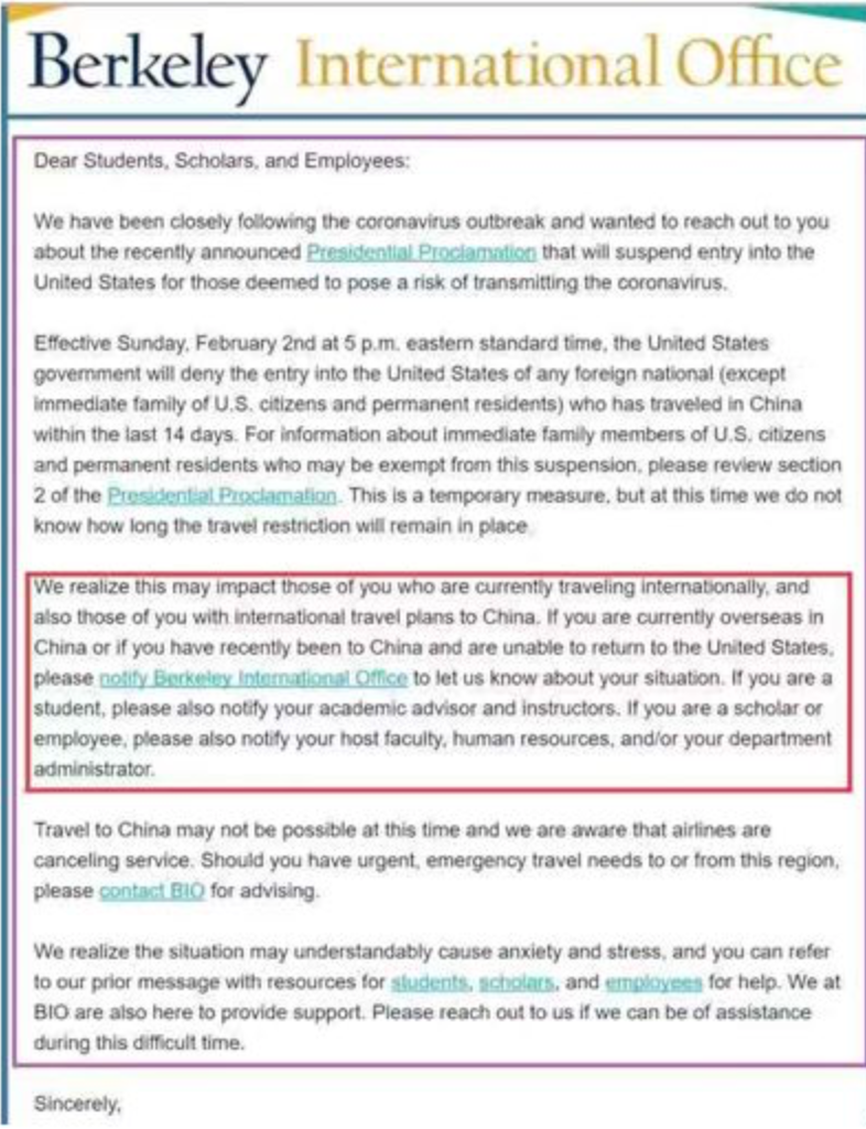 加州伯克利:“如果你现在正在中国并且无法返回美国的话,请与我们联系,让我们知道你的处境”。