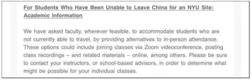 对于假期结束但无法返校的学生,NYU官方给予的回应是,学生们可以通过远程视频的方式来上课,包括线上课、替代课,但需要提前和学校联系。