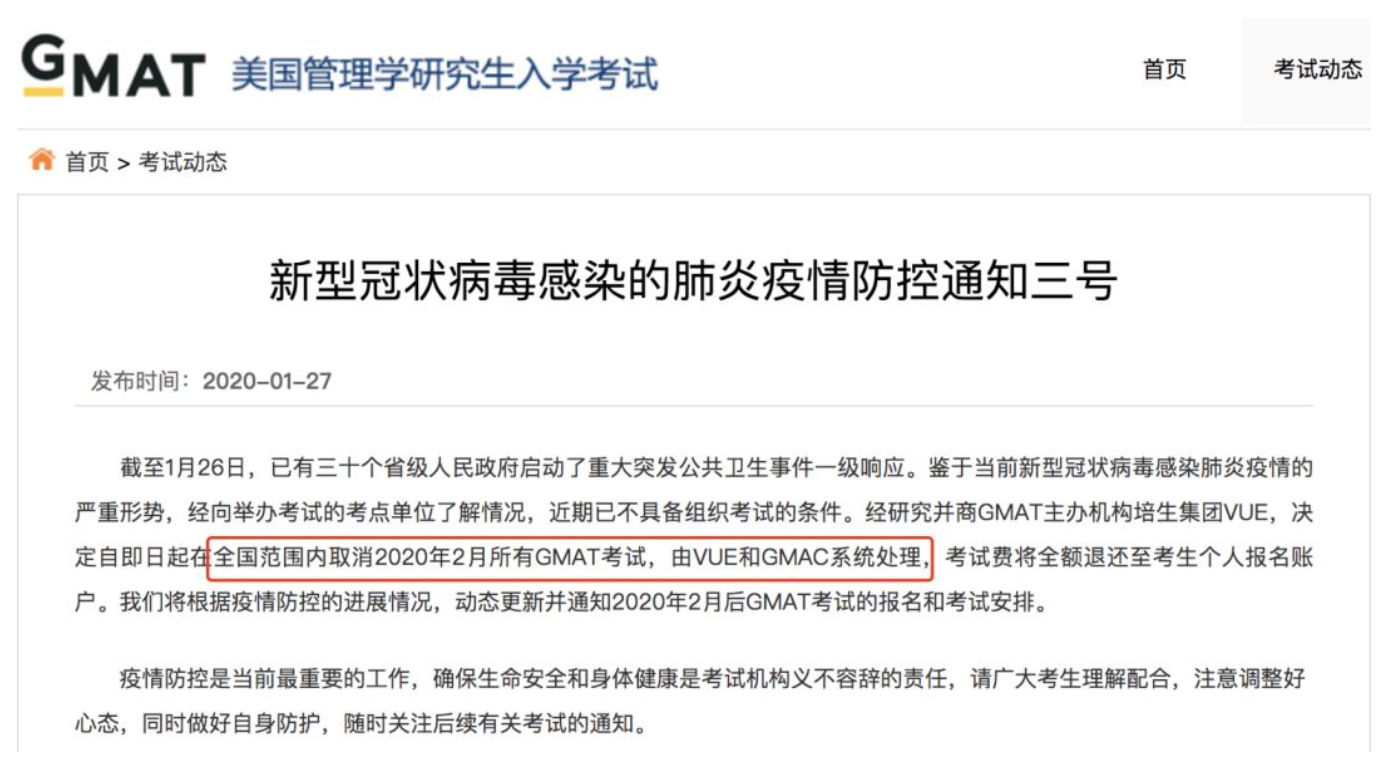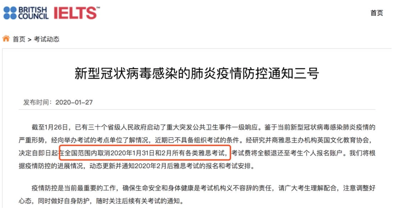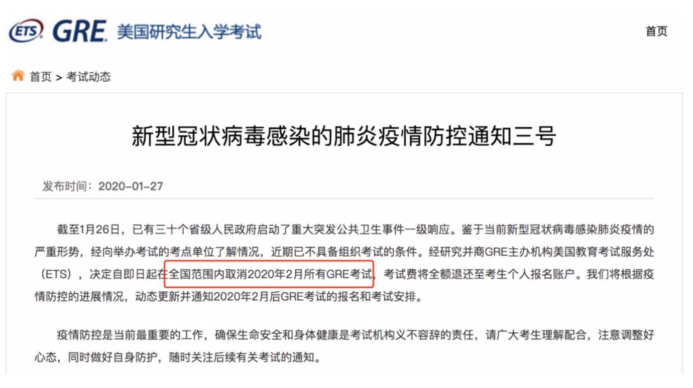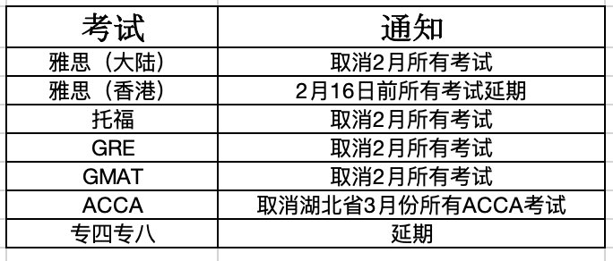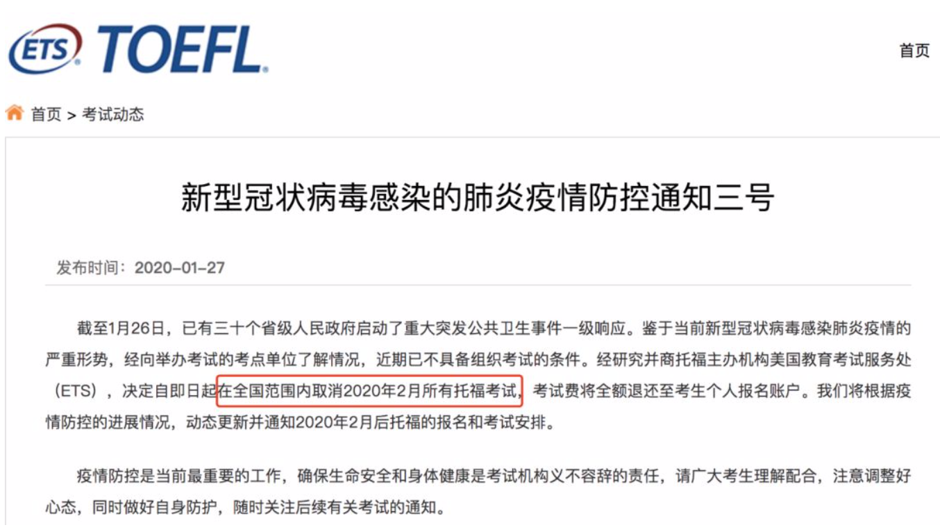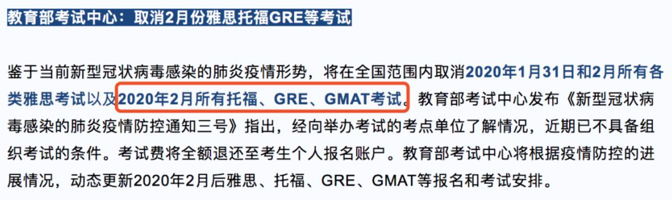 受新型冠状病毒感染肺炎疫情影响,教育部考试中心决定,将在全国范围内取消2020年2月所有雅思、托福、GRE、GMAT等报名和考试。 部分通知如下:
