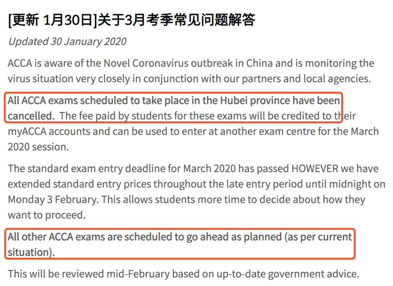 湖北省3月份所有ACCA考试均已取消 ,中国学员的退考截止日期延长至2月14日午夜(英国时间)。 所有其他地区的 ACCA 2020年3月份考试 暂定 按计划进行。