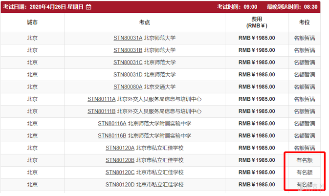 北京考点 3月 考位 暂满, 4月18日、4月26日场次有考位