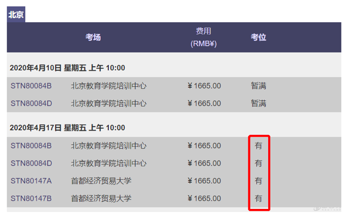北京考点 3月考位暂满, 4月17日,4月25日场次有考位