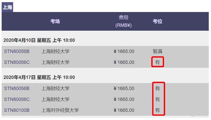 上海考点 3月考位暂满 ,4月10日,4月17日,4月25日场次有考位