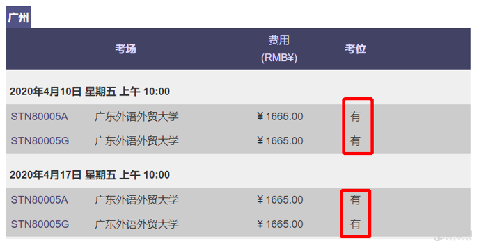 广州考点 3月考位暂满 ,4月10日,4月17日,4月25日场次有考位