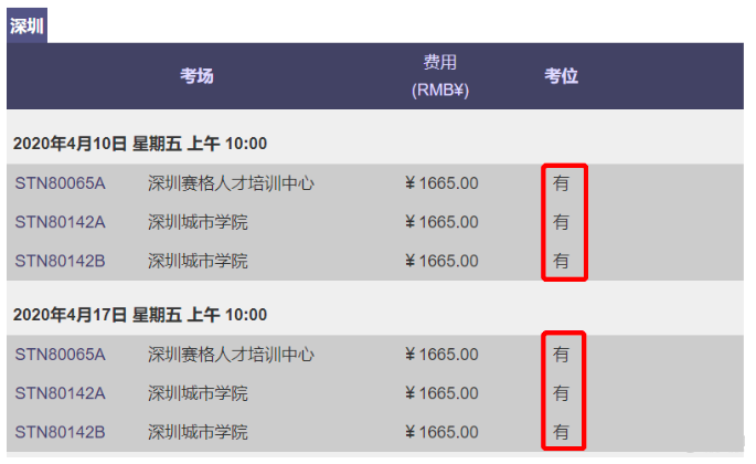 深圳考点 3月考位暂满 ,4月10日,4月17日,4月25日场次有考位