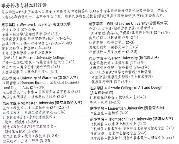 大学转学分 除此之外,范莎学院还与安省众多大学签订了转学分协议,例如麦克马斯特大学,圭尔夫大学,滑铁卢大学、瑞尔森大学等,学生不仅能在4-5年之内得到专、本两个学历文凭,在范莎获得宝贵的实践经验,还有机会进入大学进行深造和提升。