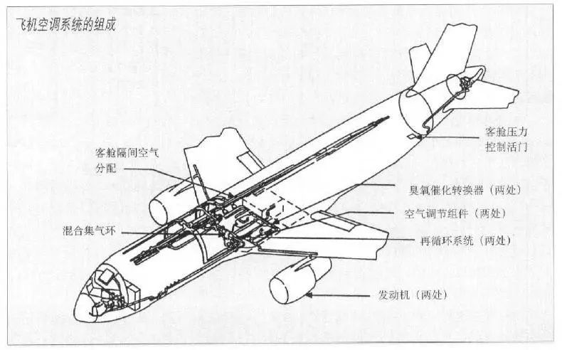 现代飞机的客舱空气调节系统包括引气系统、臭氧转换器、空气调节组件、混合集气环、再循环系统、客舱通风系统以及客舱压力控制系统。