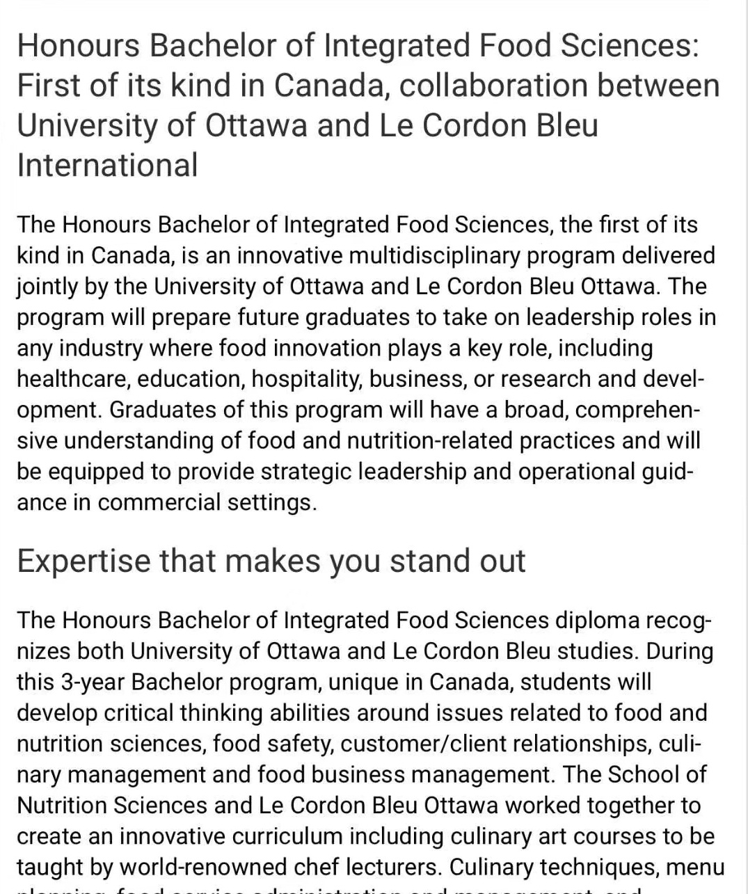 渥太华大学和世界著名的法国蓝带厨艺学院( Le Coron Bleu ) 合作创办加拿大第一个“食品科学和餐饮管理”专业。综合食品科学荣誉学士学位是加拿大首创,由渥太华大学( University of Ottawa ) 和蓝带国际学院 (Le Coron Bleu Ottawa) 联合开设的一项创新型多学科项目。该项目的毕业生将在食品有关的行业中发挥领导作用,包括医疗保健,教育,酒店,商业或研发。毕业生将对食品和营养学有广泛而全面的了解,并将有能力在商业环境中提供战略领导力和操作指导。
