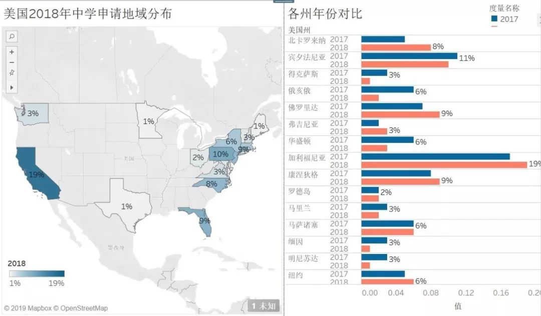 从地域分布来看,赴美读中学的中国学生主要集中于加利福尼亚州(以下简称加州)。 2018年秋季入学的中国留学生中,有17%选择加州,其次是宾夕法尼亚州(11%)、康涅狄格州(8%)、佛罗里达州(7%)。