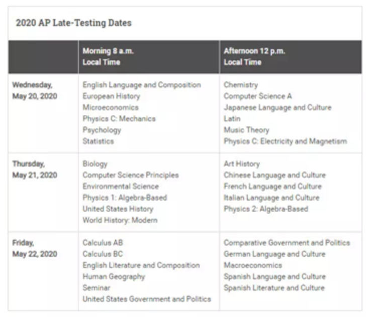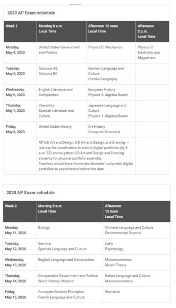 以下是2020年的AP考试时间,从5月4号持续到5月22号。